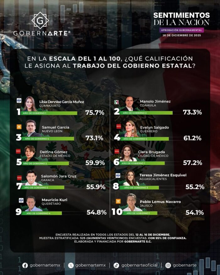 La encuesta se levantó del 12 al 16 de diciembre de 2025. Se aplicaron 525 entrevistas por entidad, con 95% de confianza.La pregunta central fue: “En una escala del 1 al 100, qué calificación le asigna al trabajo del gobierno estatal”. El estudio funciona como un termómetro del ánimo ciudadano. En este contexto, Libia Dennise García Muñoz Ledo se consolida como una gobernadora con amplio margen de confianza y liderazgo nacional emergente.