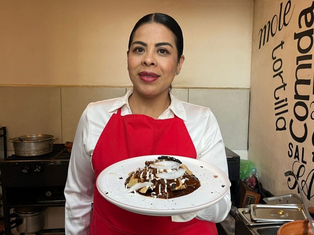 María Barrera, cocinera de Irapuato, presenta su nueva y audaz salsa negra con mezcal para chilaquiles.